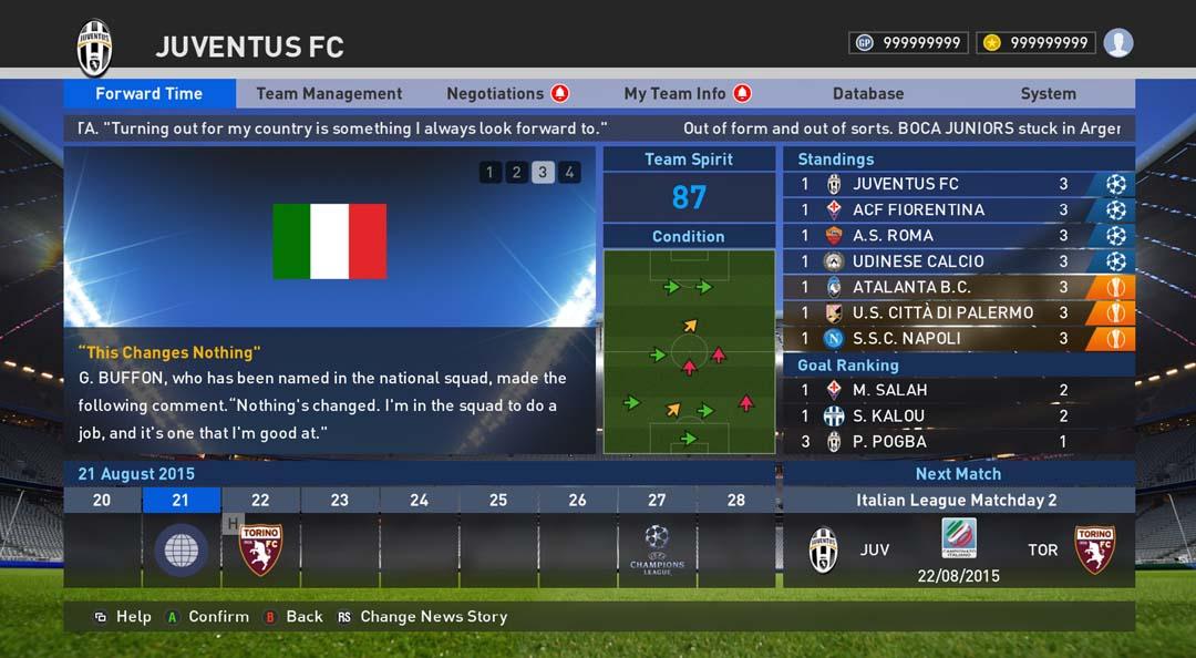 في الوقت ذاته عانى اليوفنتوس من تطبيق نفس الأسلوب بسبب سرعات لاعبي خط الوسط المحدودة في التمرير وعدم قدرة المهاجمين على التعامل مع الإلتحامات الجسدية القوية لمدافعي الخصم، ولكن تكتل لاعبي السيدة العجوز في منتصف الملعب وامتلاك لاعبين في خط الوسط بقدرات جسمانية وفنية قوية كبوجبا وفيدال (الانتقالات الأخيرة لم يتم تطبيقها داخل اللعبة بعد) جعل من الصعب على أي لاعب المرور تجاه حارس المرمى على الأقل في الكرات الأرضية والإشتباكات المباشرة ومواقف لاعب ضد لاعب.